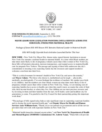 User Ciara Collins has attached Mayor_s_Press_Office_Sept_6b_2022.pdf to MAYOR ADAMS SIGNS LEGISLATION PROVIDING DOULA SERVICES ACROSS FIVE BOROUGHS, STRENGTHEN MATERNAL HEALTH April 10th, 2024 19:03