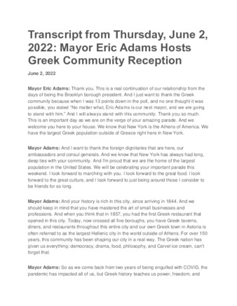 | User Ciara Collins has attached Mayor_s_Press_Office_June_2a_2022.pdf to Transcript from Thursday, June 2, 2022: Mayor Eric Adams Hosts Greek Community Reception |
