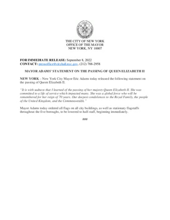 User Ciara Collins has attached Mayor_s_Press_Office_Sept_8c_2022.pdf to MAYOR ADAMS’ STATEMENT ON THE PASSING OF QUEEN ELIZABETH II  April 10th, 2024 19:23