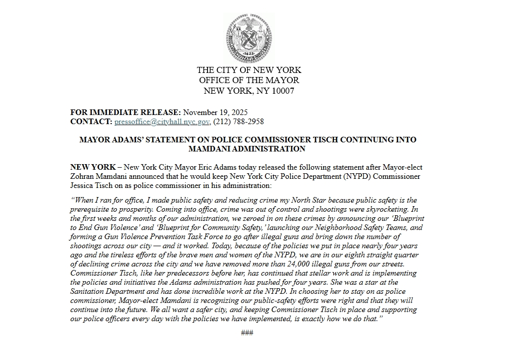 | User Nessa Raskin has attached Screenshot_19-11-2025_134012_admin.govdelivery.com.jpeg to MAYOR ADAMS’ STATEMENT ON POLICE COMMISSIONER TISCH CONTINUING INTO MAMDANI ADMINISTRATION |
