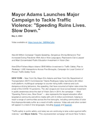 | User Ciara Collins has attached Mayor_s_Press_Office_May_2c_2022.pdf to Mayor Adams Launches Major Campaign to Tackle Traffic Violence: "Speeding Ruins Lives. Slow Down." |