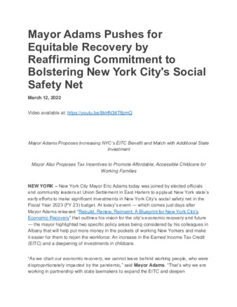| User Ciara Collins has attached Mayor_s_Press_Office_March_12a_2022.pdf to Mayor Adams Pushes for Equitable Recovery by Reaffirming Commitment to Bolstering New York City's Social Safety Net |
